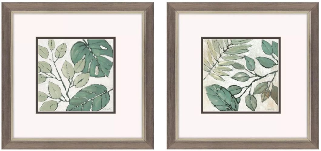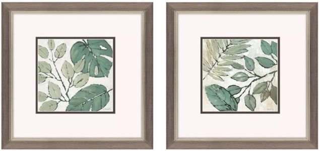 Leafy green foliage is matted in white. Framed in a brushed pewter finish molding with silver lip, Green Indian Summer wall art set by Loreth and designer Jordan Glassco Smith brings serene coastal elegance to any room. Perfect for enhancing living spaces, bedrooms, or offices with natural, refreshing charm.Read More