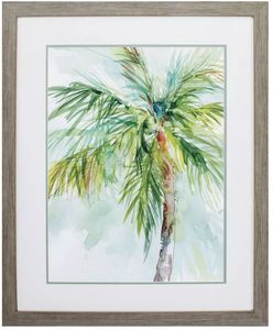 A tropical palm tree sways in the breeze. Double matted in white and sea mist and framed in a block profile moulding in a distressed wood finish. Whether placed in a living room, bedroom, or hallway, this artwork serves as a versatile accent piece.Read More