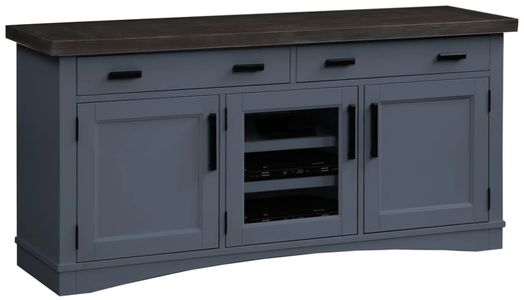 Give your living area an instant refresh with the addition of the Americana Modern 63-inch tv console with power center. A tastefully designed media option, it features closed storage, glass doors for media components, and a timeless denim finish accented with a contrasting wood-grain top and metal hardware.Read More