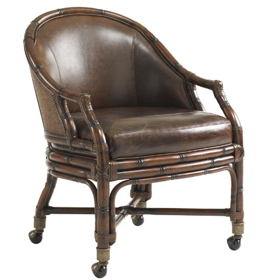 An elegant woven rattan outside back complements the rich leather seat and inside back. Aged brass burnished casters are featured at the bottom. Available only as shown in Leather 928371 - Padgett \?a supple chestnut brown pull-up leather.Read More