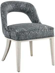 Perfect for dining, office, or vanity use, this open back accent chair features a charcoal and light gray animal print chenille with welt trim details over a solid wood frame in a lightly distressed off-white finish with light gray glazed distressing. Seat height is 20". Packed 2 per box but priced individually. Must be purchased in increments of 2.Read More